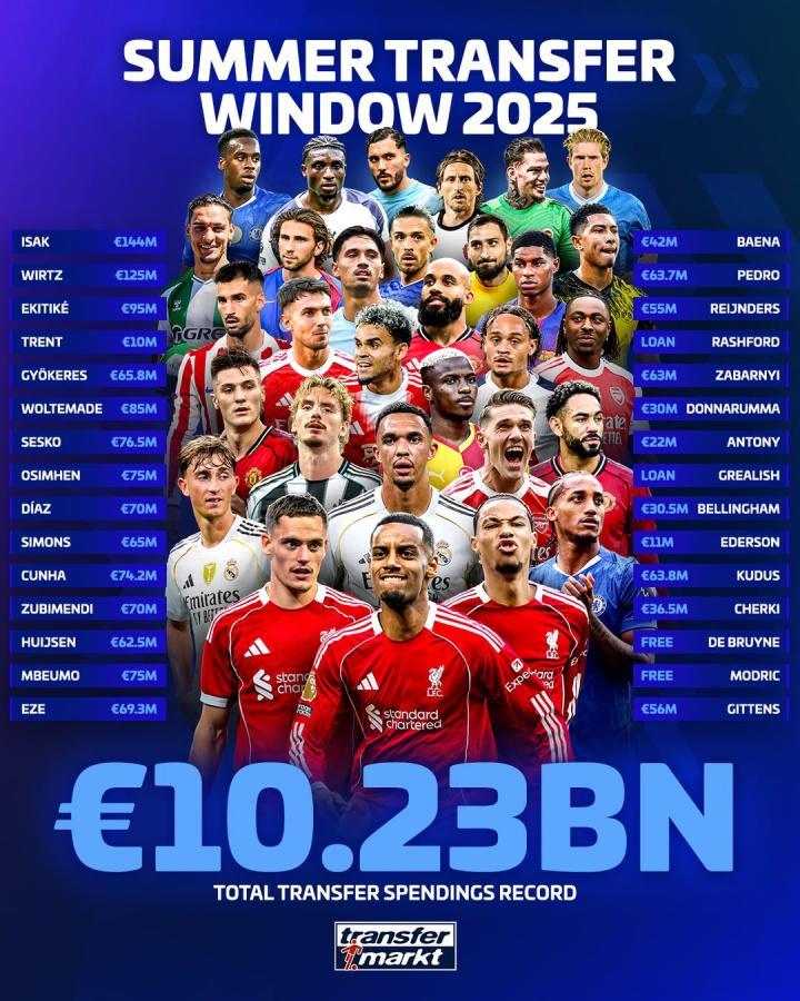 德转发布海报,该机构统计表示,足坛今夏转会窗的总支出达到惊人的102.3亿欧。